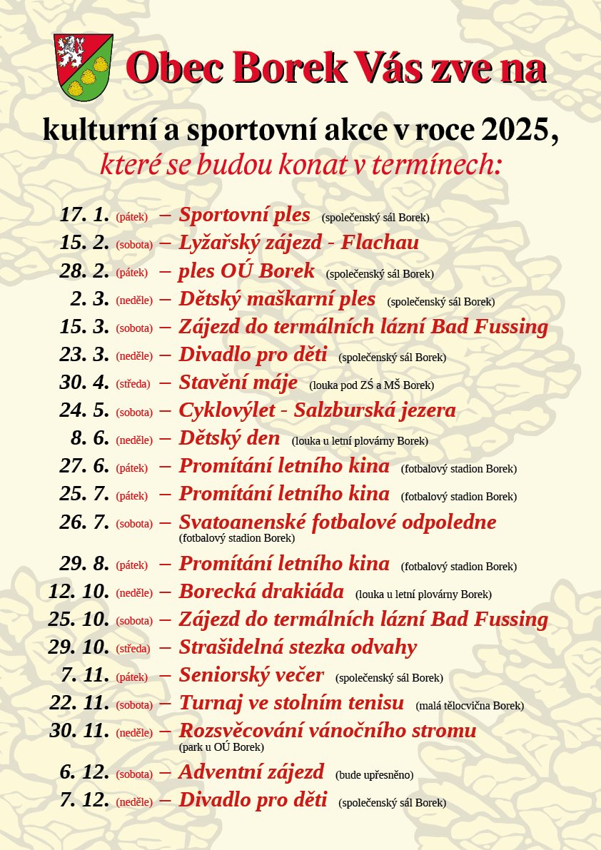 Přehled kulturních a společenských akcí pořádaných obcí Borek pro rok 2025
